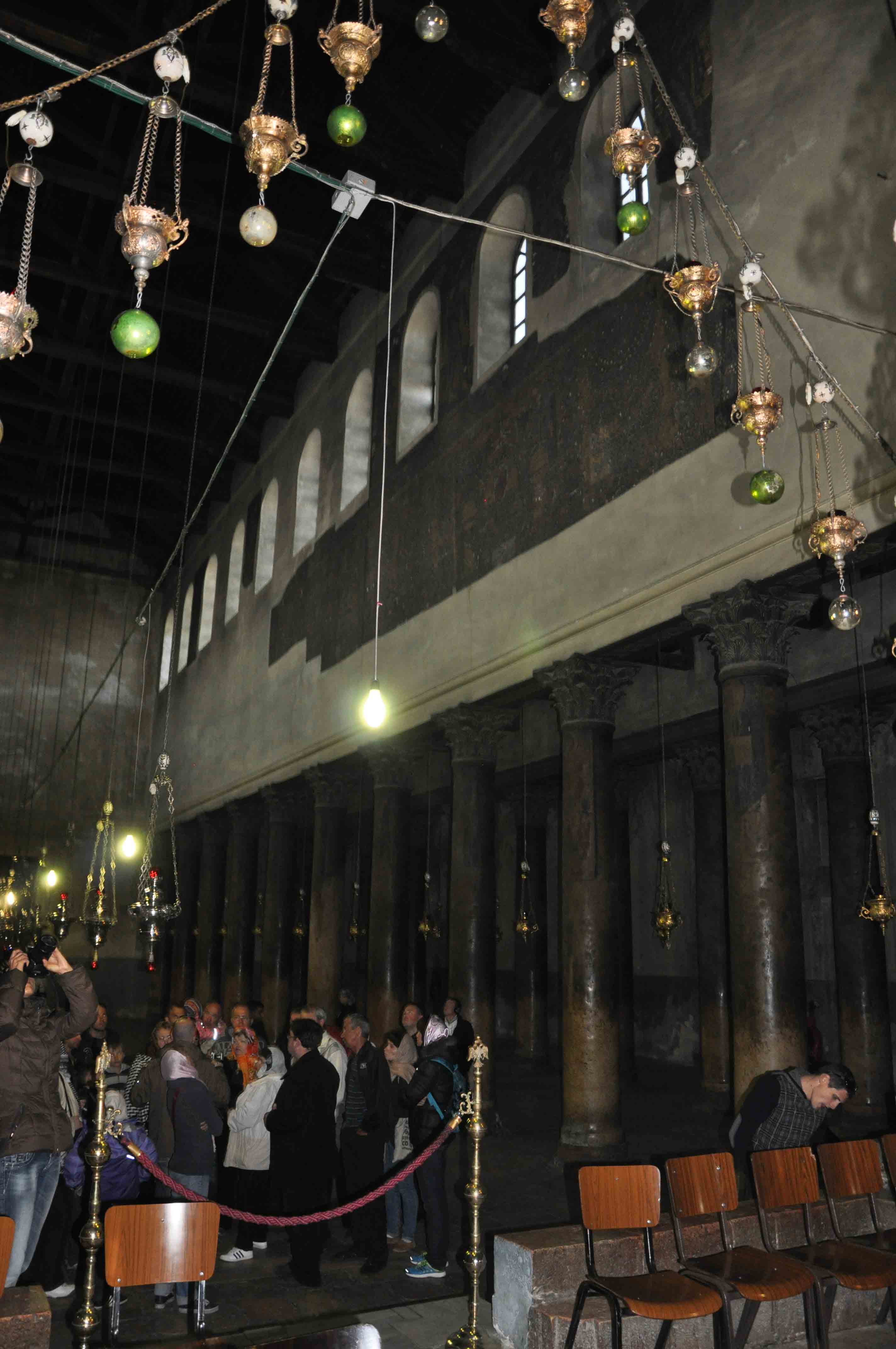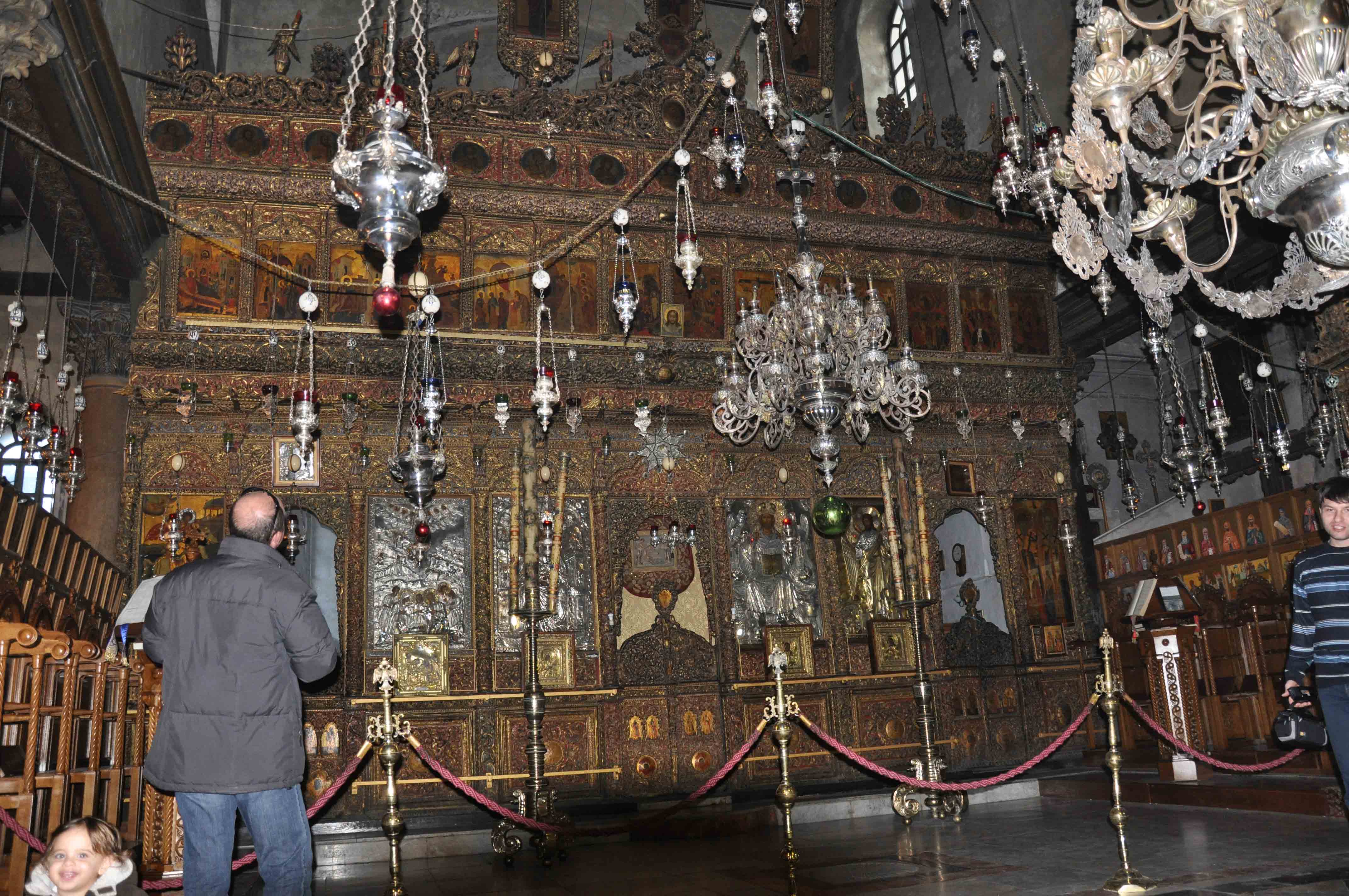 A l’intérieur ambiance folklorique, à l’instar du Saint Sépulcre le monde, que dis-je, l’univers chrétien se retrouve ici : toutes couleurs, toutes nationalités. Mon fils fait des ravages, notre guide le présente à ses collègues et nous restons un moment, ma femme et moi, le sourire pincé, à voir notre petit circoncis passer de bras en bras sous les exclamations. L’encens prend les narines, aux plafonds pendent des centaines de vases, de lustres…